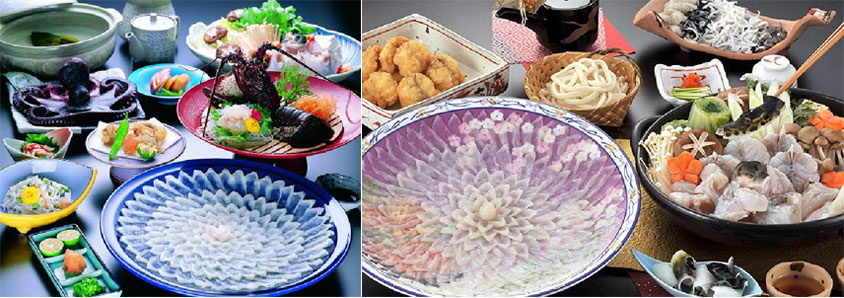 河豚:中国古代有“拼死吃河豚”之说,其味道之鲜美、毒之剧烈,可从这句话中想象出来。日本做河豚料理的大师傅,需要有专业资格。他们的做法也很特别,把河豚的肉切得比纸还薄,呈菊花形一片一片地摆在盘子里。吃的时候沾上一点略带柚子味的酱油,河豚的鲜美,在口中瞬间就变成一种“幸福”。日本人称河豚为“珍味”